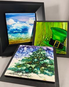 Besides ceramic tiles, I also paint on Yupo paper with the alcohol inks. This is a slick paper that allows the ink to slide on the surface. Paintings are then matted and framed with a UV protective glass.